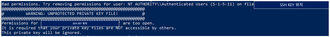 icacls "SSH KEY 위치" /grant:r "$($env:USERNAME):(R)" //현재 로그인한 사용자만 읽기권한 부여
